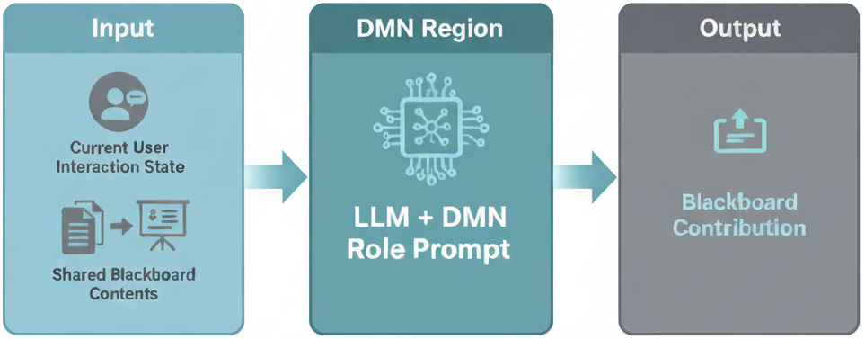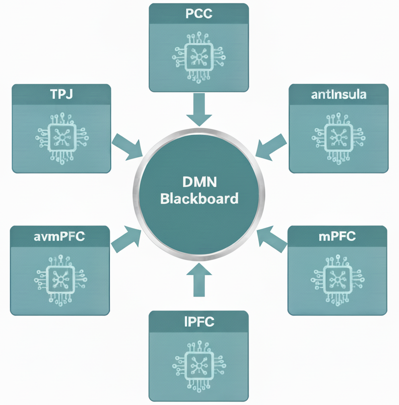 At the core of this process is a collaborative memory space called the blackboard, where DMN-inspired modules negotiate among memory, emotion, future goals, and conceptual alternatives.