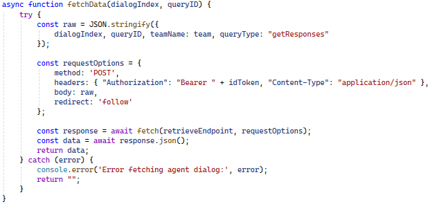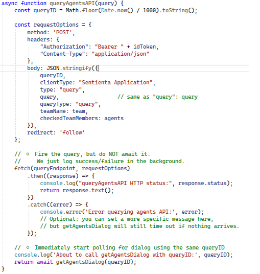 You supply the idToken for authentication, and a queryID which is just an index to assign to the dialog so when you query for the results, Sentienta will know which dialog you want. The teamName is the team that you want to query, and the agents is a string of comma-separated agent names that you assigned to the team.