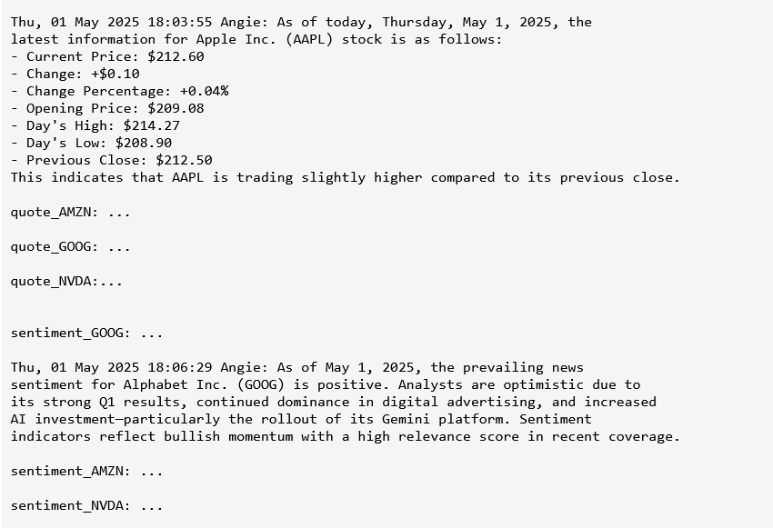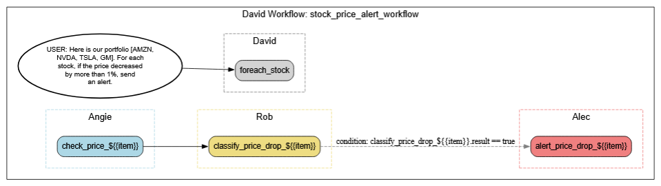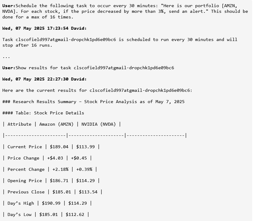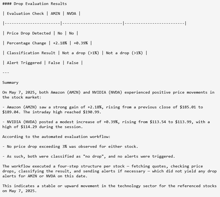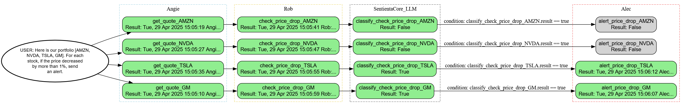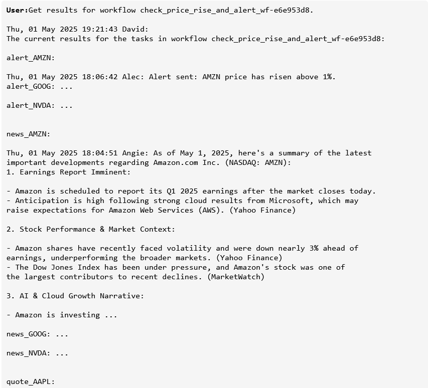 Once the workflow is created, the user simply asks it to run every 30 minutes—and Sentienta schedules recurring executions automatically. Each run pulls updated stock prices, assesses whether either AMZN or NVDA has dropped by 3%, and triggers alerts if so. Users can check task status, inspect the workflow graph, or fetch results at any time—all via natural language. As the transcript shows, there’s no manual reconfiguration between runs. The system just works—consistently, transparently, and in parallel with any other workflows the user initiates.