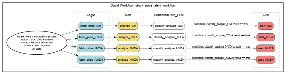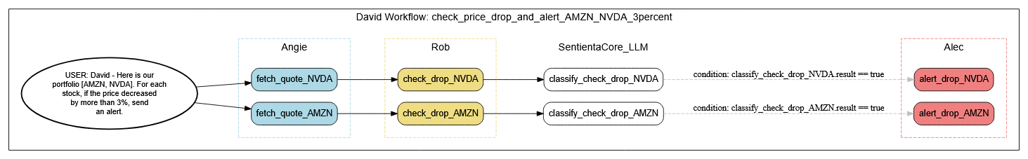 The user’s request is simple on the surface—“Monitor AMZN and NVDA for a 3% drop and alert me”—but that instruction triggers a multi-layered automation. Sentienta interprets the goal, identifies that real-time pricing data is needed, calculates change percentages, evaluates conditions, and routes alert tasks if thresholds are met. Each step is delegated to the appropriate agent using the right tools. All of it is wrapped into a workflow that is created instantly through natural language—no coding, no flowchart building, no manual agent assignment.
