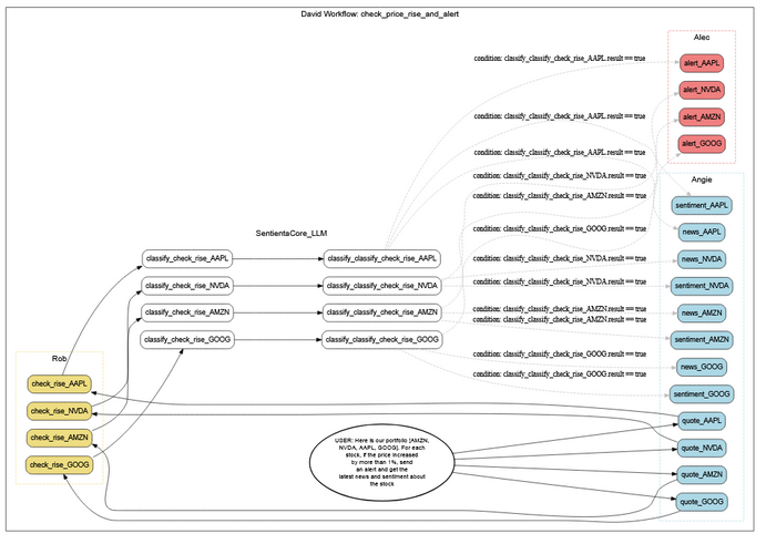 In past posts, we’ve seen how natural language workflows simplify complex portfolio monitoring, and how scheduled tasks let agents run without user input. Today, we’re combining these powers in a single instruction: a user defines a high-level goal—monitor AMZN and NVDA for 3% price drops—and Sentienta handles the rest. It parses the language, builds the workflow, schedules it to run every 30 minutes, and manages each run intelligently. Multiple scheduled workflows can run in parallel, each executing complex logic—no code, no setup screens, just natural language.